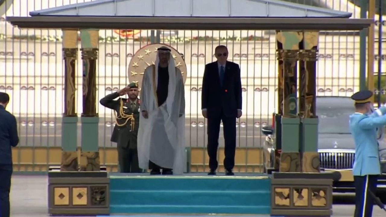 Al Nahyan, Muhafız Alayı Tören Kıtası'nı "Merhaba asker" diyerek selamladı. Cumhurbaşkanı Erdoğan ve Al Nahyan birbirlerine heyetlerini takdim etti.